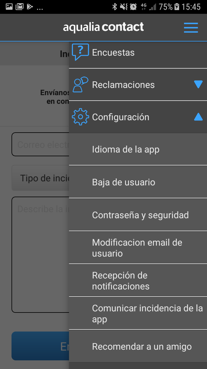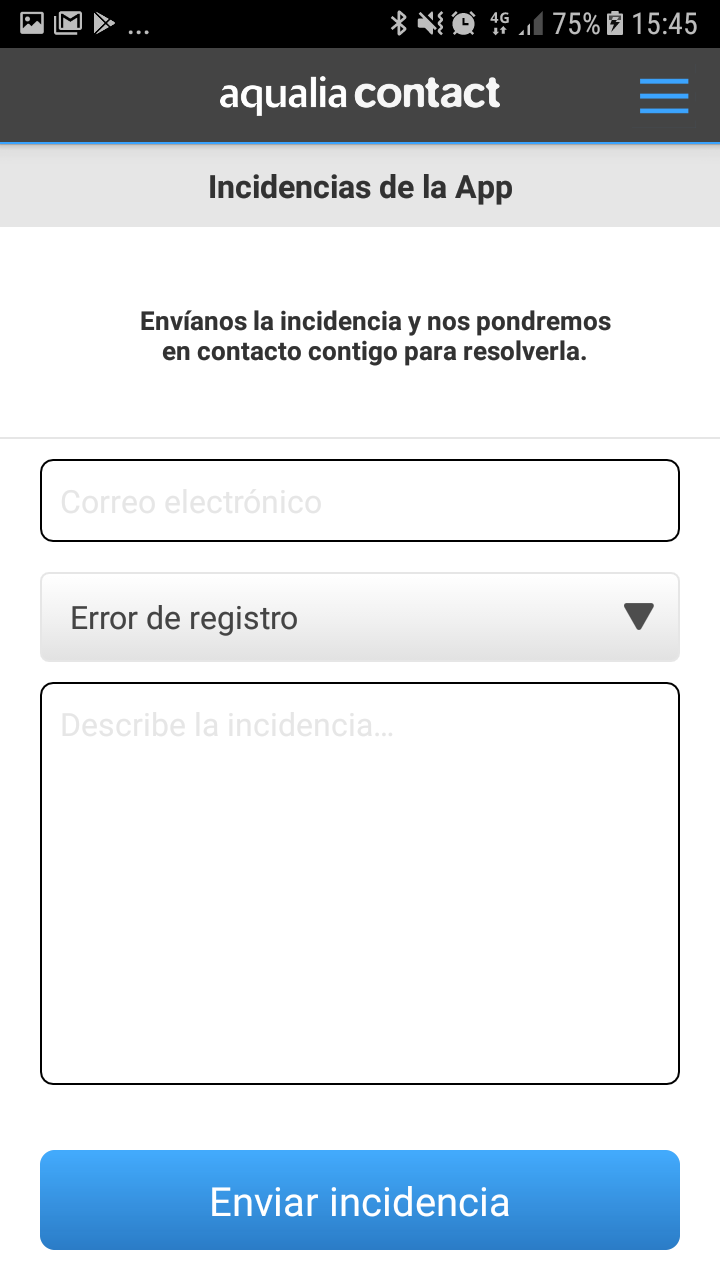 La aplicación móvil permite reportar incidencias mediante un formulario ubicado en el Menú: apartado Configuración- "comunicar incidencia de la app".
